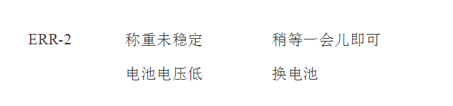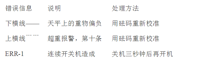 4, 如需取下天平上的圓秤盤,請(qǐng)將秤盤按順時(shí)針方向轉(zhuǎn)動(dòng)后再取下,切勿將秤盤往上硬撥,以免損壞傳感器。 5, 出現(xiàn)錯(cuò)誤信息,請(qǐng)查下表。