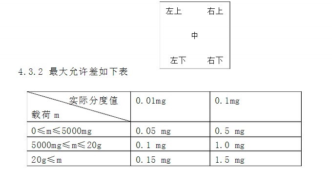 4.3.1 先檢查零點,再用已經(jīng)校準過的三個砝碼校準天平2mg,50mg,80g。放在如下圖中心、左上,左下,右上,右下五個位置,各位置示值誤差不得超過zui大允許差。填寫R-SOP/2-0202-01《XS205電子